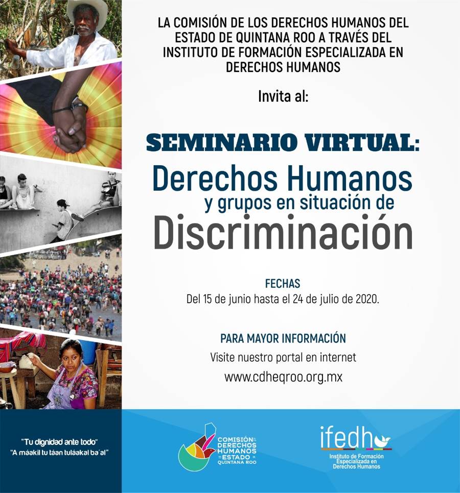 La CDHEQROO invita al Seminario virtual gratuito: Derechos Humanos y grupos en situación de discriminación dirigido a: Personas servidoras públicas y población en general del estado de Quintana Roo.