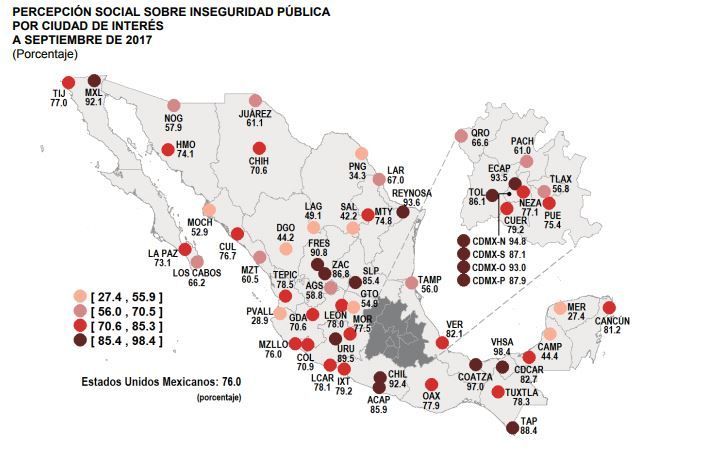 En contraste, las ciudades con percepción de inseguridad baja en 2018 fueron San Pedro Garza García (Nuevo León), con 23.1%; Mérida (Yucatán), 28.8%; Saltillo (Coahuila), 30.5%; Puerto Vallarta (Jalisco), 38.7%; Durango (capital), 39.5%; y Los Cabos (Baja California Sur), 42.3%.