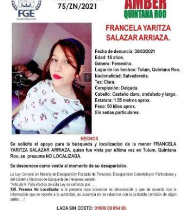 Francela Yaritza Salazar Arriaza de 17 años fue vista por última vez el día 28 de marzo, y no cuenta con la nacionalidad mexicana a diferencia de su madre.