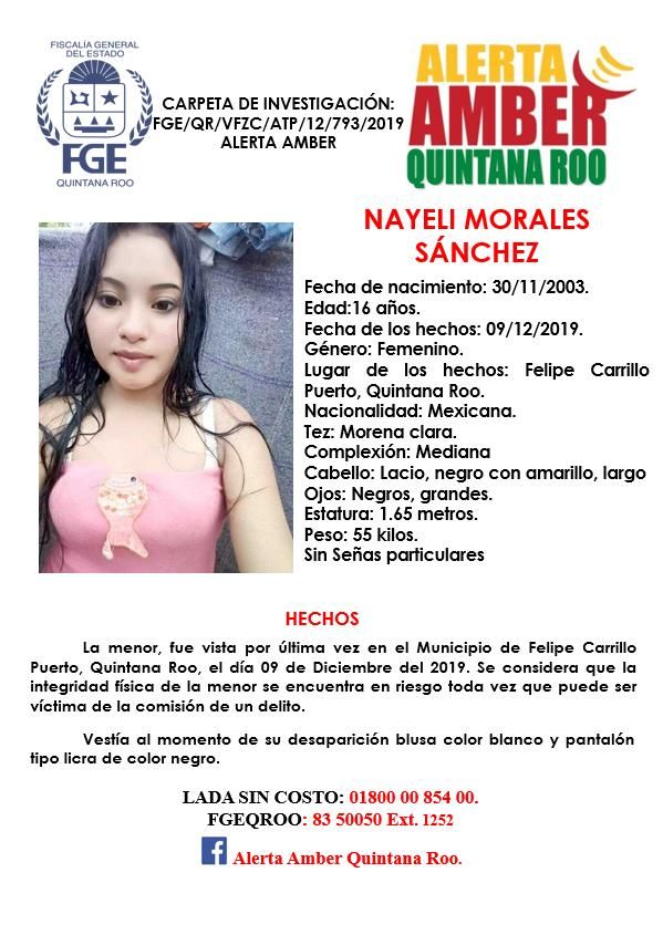 Piden ayuda para localizar a Nayeli Morales Sánchez, desaparecida en el municipio de Felipe Carrillo Puerto el 09 de diciembre de 2019.