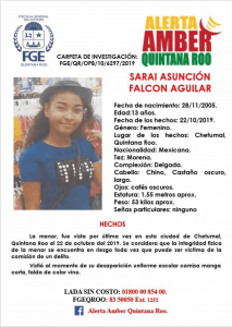 Piden ayuda para localizar a Sarai Asunción Falcón Aguilar de 13 años de edad, desaparecida el 22 de octubre de 2019 en Chetumal, Quintana Roo