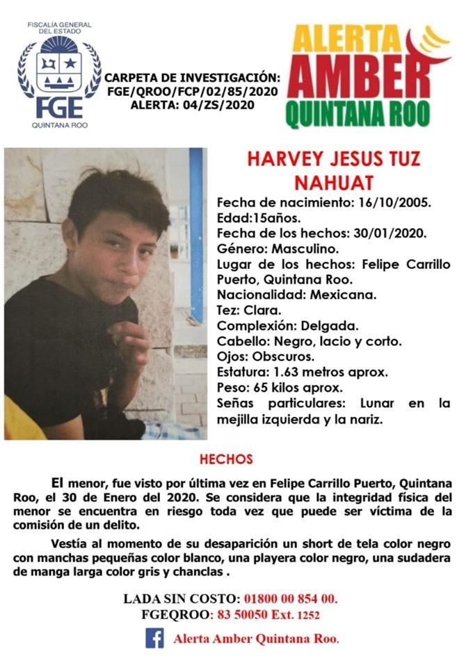 Se solicita su colaboración para localizar a Harvey Jesús Tuz Nahuat, quien fue visto por última vez en Felipe Carrillo Puerto el día 30 de enero de 2020.