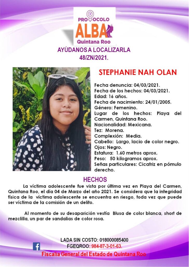 • Stephanie Nah Olan de 16 años fue vista por última vez en Playa del Carmen, Quintana Roo el 4 de marzo de 2021. Al momento de su desaparición vestía blusa de color blanca, short de mezclilla y sandalias color rosa.