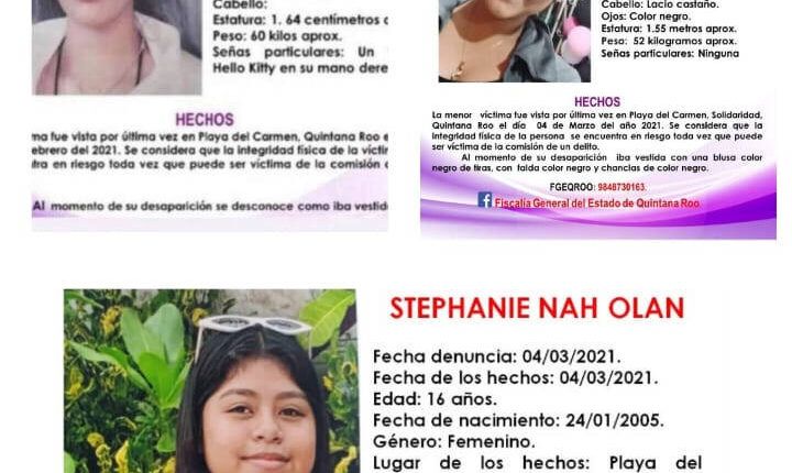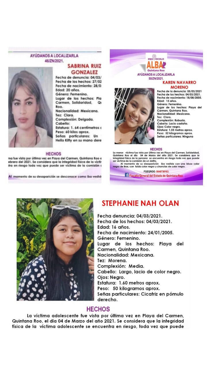 Las autoridades de Quintana Roo solicitan el apoyo de la comunidad para localizar a las jóvenes Karen Navarro Moreno, Sabrina Ruiz González y Stephanie Nah Olan, quienes desaparecieron en Playa del Carmen, Quintana Roo.