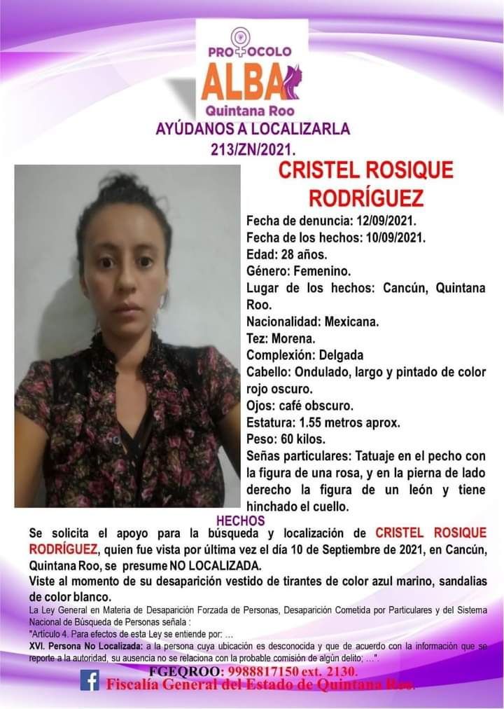 Se solicita el apoyo para la búsqueda y localización de Cristel Rosique Rodríguez, quien fue vista por última vez el día 10 de Septiembre de 2021, en Cancún, Quintana Roo
