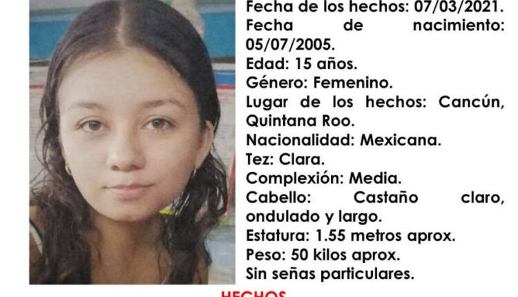 Edad: 15 años. Lugar de los hechos: Cancún, Quintana Roo. Tez: Clara. Complexión: Media. Cabello: Castaño claro, ondulado y largo. Estatura: 1.55 metros aprox. Peso: 50 kilos aprox. Sin señas particulares.