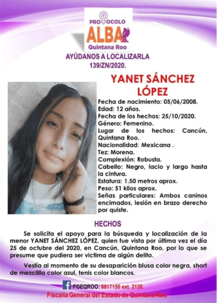 Fue vista por última vez el día 25 de octubre del 2020, en Cancún, Quintana Roo; por lo que se presume que pudiera ser víctima de algún delito.