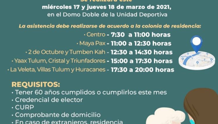 Este miércoles 17 de marzo, a partir de las 8:00 de la mañana, inicia el proceso de vacunación contra Covid-19 para adultos mayores de 60 años en Tulum.