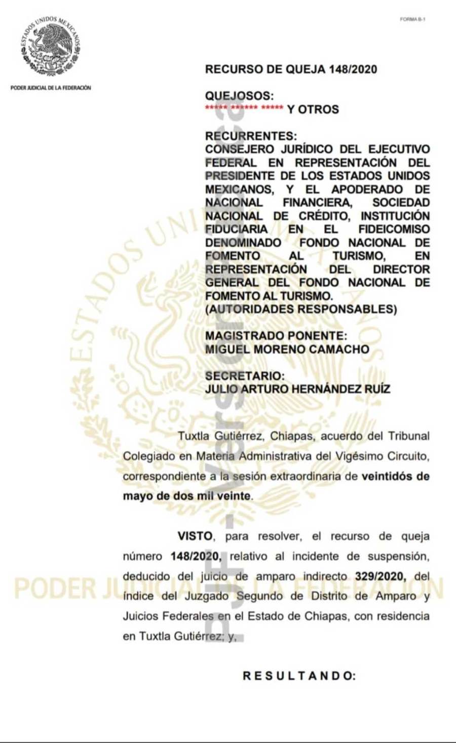 Frente a la medida cautelar otorgada por el juzgado, la Consejería Jurídica de la Presidencia de la República y Nacional Financiera en representación de la dirección del Fondo Nacional de Fomento al Turismo promovieron el recurso de queja correspondiente el 21 de mayo pasado y al siguiente día el tribunal federal en Tuxtla declaró por unanimidad fundada la impugnación.