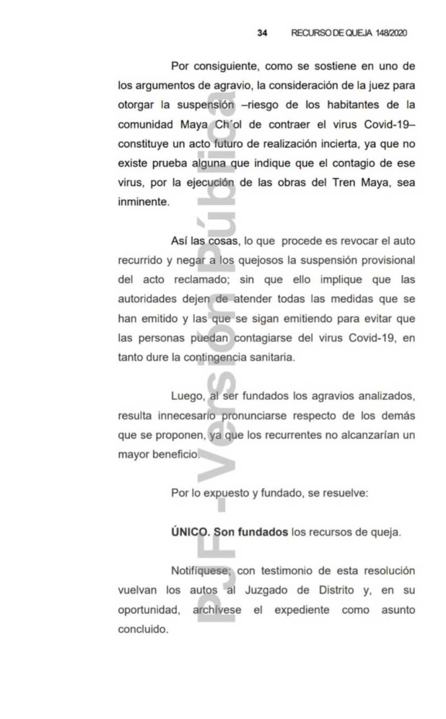 El 7 de mayo el Juzgado Segundo de Distrito de Amparo y Juicios Federales de la capital chiapaneca concedió suspensión provisional a representantes del Pueblo Ch´ol para frenar el proyecto ferroviario de la Península de Yucatán en el tramo de Palenque, Salto del Agua y Ocosingo para evitar un riesgo de contagio, según la demanda de garantías.