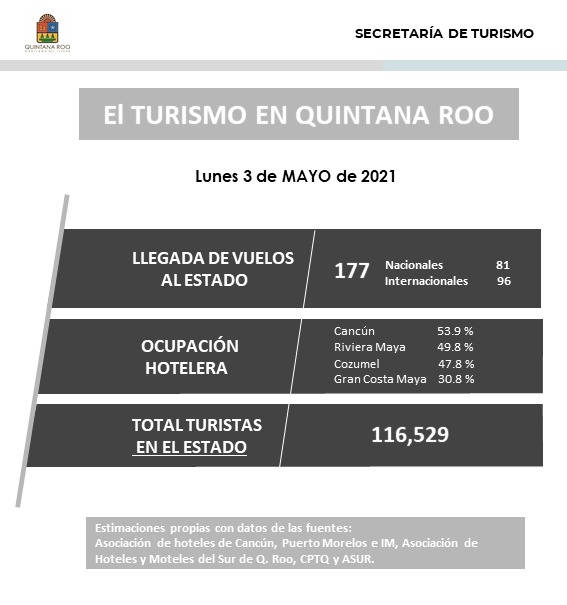 A inicios de esta semana las estimaciones del reporte de la Sedetur anuncian la llegada de 116 mil 529 turistas en total a Quintana Roo, así como el aterrizaje de 177 vuelos a los aeropuertos del estado.