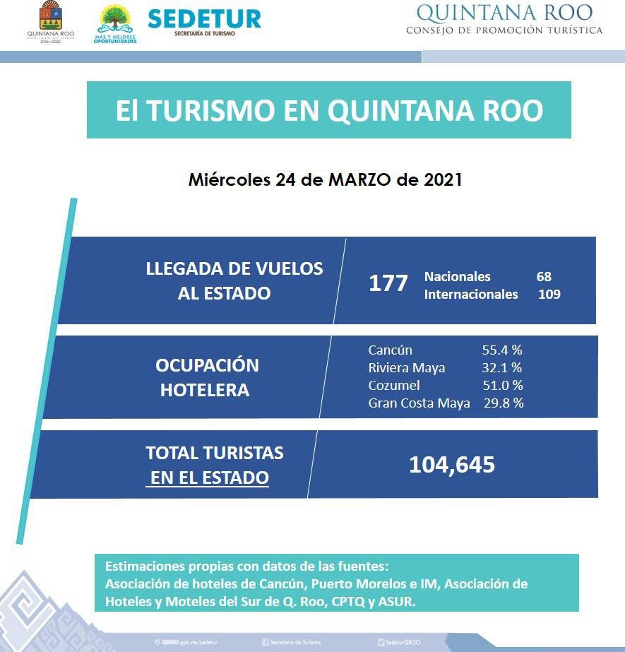 Mediante el aterrizaje de 177 vuelos a Quintana Roo, 109 de llegadas internacionales y 68 de diferentes estados de la República mexicana; el estado se coloca con 104 mil 645 turistas en total.