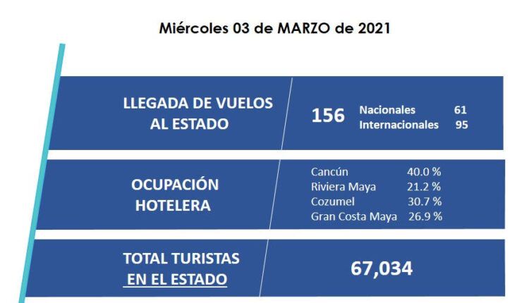 Mediante el reporte semanal por parte de la Secretaría de Turismo del estado (Sedetur), se dio a conocer el pequeño pero reconocido incremento porcentual de ocupación hotelera en Cancún, que la última semana de febrero se mantenía en 38.1 por ciento, iniciando este mes con 40 por ciento; en este tema le sigue Cozumel con 30.7 por ciento, Gran Costa Maya con 26.9 por ciento y la Riviera Maya con 21.9 por ciento.