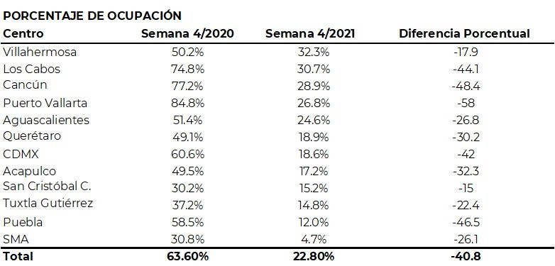 Detalló que con el 32.3 por ciento de ocupación en la semana 4 de 2021, Villahermosa registra 17.9 puntos porcentuales menos que en la misma semana de 2020; seguida de Los Cabos, con 30.7 por ciento y 44.1 puntos menos; Cancún, 28.9 por ciento y menos 48.4 puntos; Puerto Vallarta, 26.8 por ciento y menos 58 puntos; Aguascalientes, 24.6 por ciento y menos 26.8 puntos; Querétaro, 18.9 por ciento y menos 30.2 puntos; Ciudad de México, 18.6 por ciento y menos 42 puntos; Acapulco, 17.2 por ciento y menos 32.3 puntos; San Cristóbal de las Casas, 15.2 por ciento y menos 15 puntos; Tuxtla Gutiérrez, 14.8 por ciento y menos 22.4 puntos; Puebla, 12 por ciento y menos 46.5 puntos; y San Miguel de Allende, 4.7 por ciento de ocupación, lo que equivale a 26.1 puntos porcentuales menos que el año pasado.