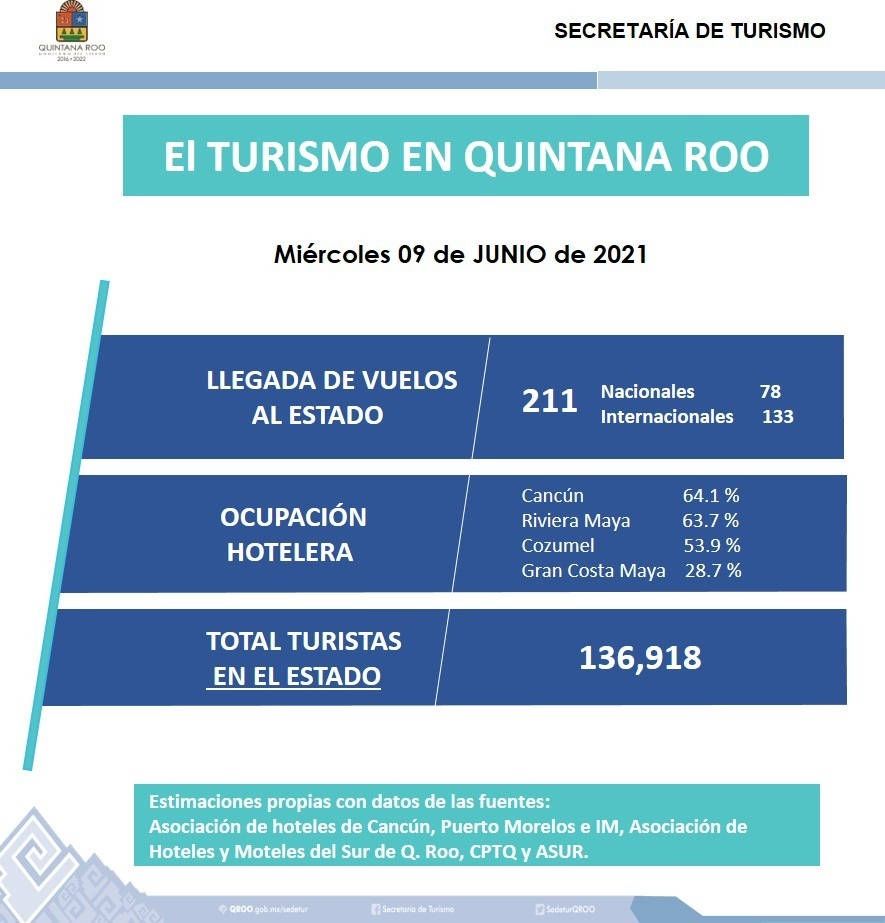 En este sentido, Cancún como destino turístico se mantiene como primero en temas de ocupación hotelera con 64.1 por ciento y en esta ocasión seguido de Riviera Maya con 63. 7 por ciento, Cozumel con 53. 9 por ciento y Gran Costa Maya con 28. 7 por ciento; además de presentar un número total de 136 mil 918 turistas.
