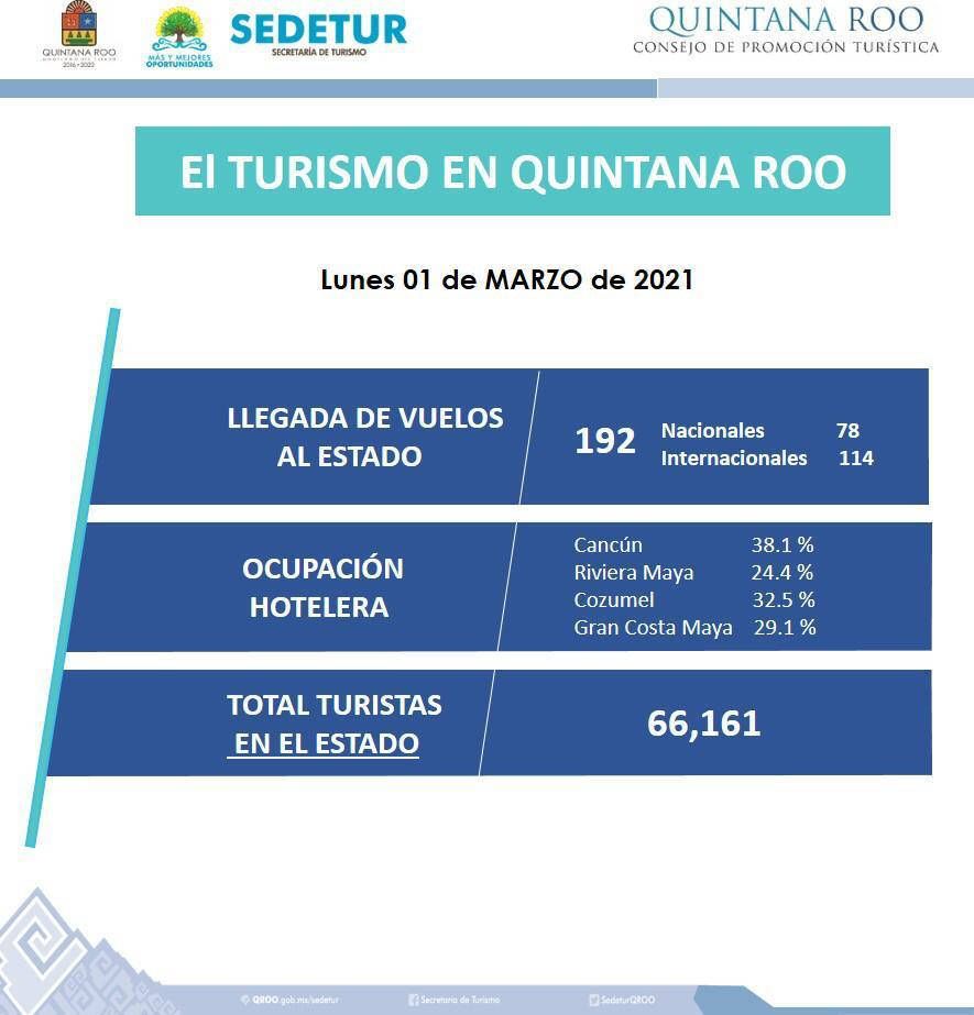 Para informar sobre la afluencia turística en Quintana Roo durante la última semana de febrero, a través del reporte por parte de la Secretaría de Turismo (Sedetur), se dio a conocer que en ese tiempo fueron 66 mil 161 el total de turistas que visitaron el estado.