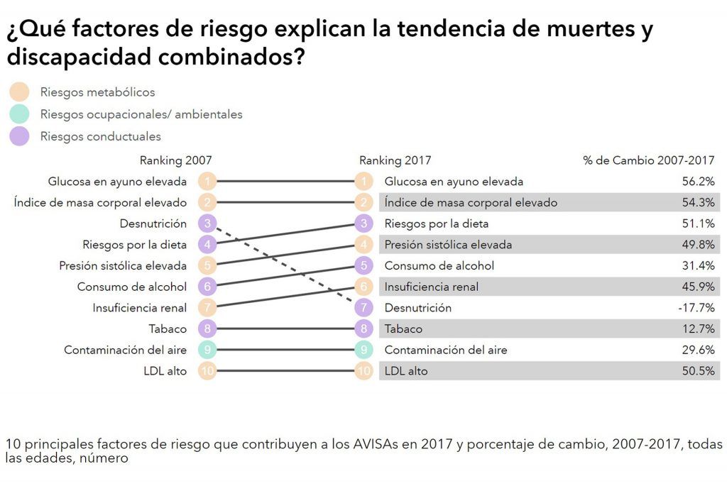 El estudio ‘Carga Mundial de la Enfermedad 2017’, presentado el pasado 3 de abril y realizado por el Instituto de la Métrica y de Evaluación de la Salud (IHME, por sus siglas en inglés) de la Universidad de Washington, revela además que en 27 años la obesidad en México pasó del sexto al segundo lugar, como detonante de padecimientos como cardiopatía isquémica, enfermedad renal y diabetes, entre otras.