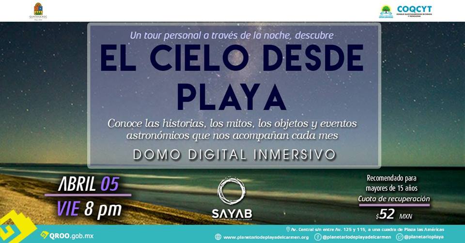 20:00 horas – “El Cielo desde Playa” Domo Digital Inmersivo. Mayores de 15 años. Planetario Sayab. Cuota de recuperación: $52 pesos.