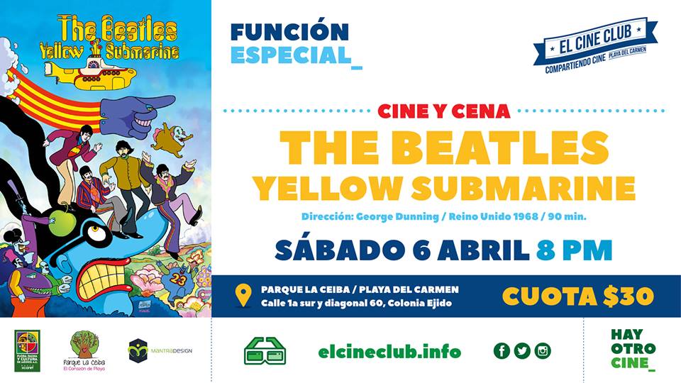 20:00 horas – El Cineclub presenta función especial Cine y Cena con la cinta: “The Beatles, Yellow Submarine” (Dir. George Dunning / Reino Unido 1968). Parque La Ceiba. Cuota: $30 pesos.