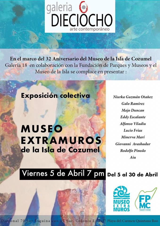 19:00 horas – Inauguración de la Exposición Colectiva “Museo Extramuros de la Isla de Cozumel”. Exposición de artistas visuales de la Isla de Cozumel. Exhibición permanente del 5 al 30 de abril. Galería 18, Diagonal 70 esquina con 13 Sur, Col, Ejidal. Entrada libre.