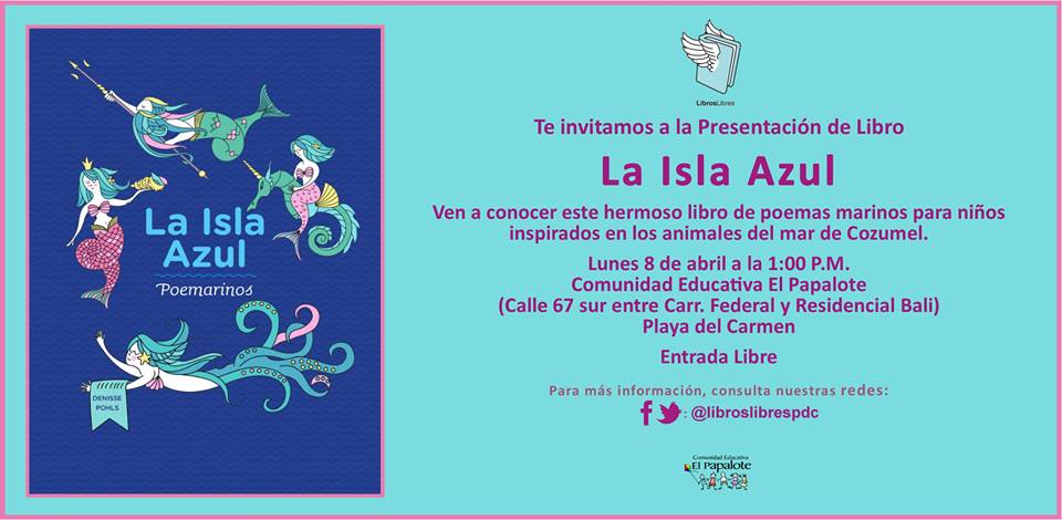 13:00 horas – Presentación del Libro “La Isla Azul”, poemarinos de Denisse Pohls. Coordinado por Libros Libres. Comunidad Educativa El Papalote. Entrada libre.