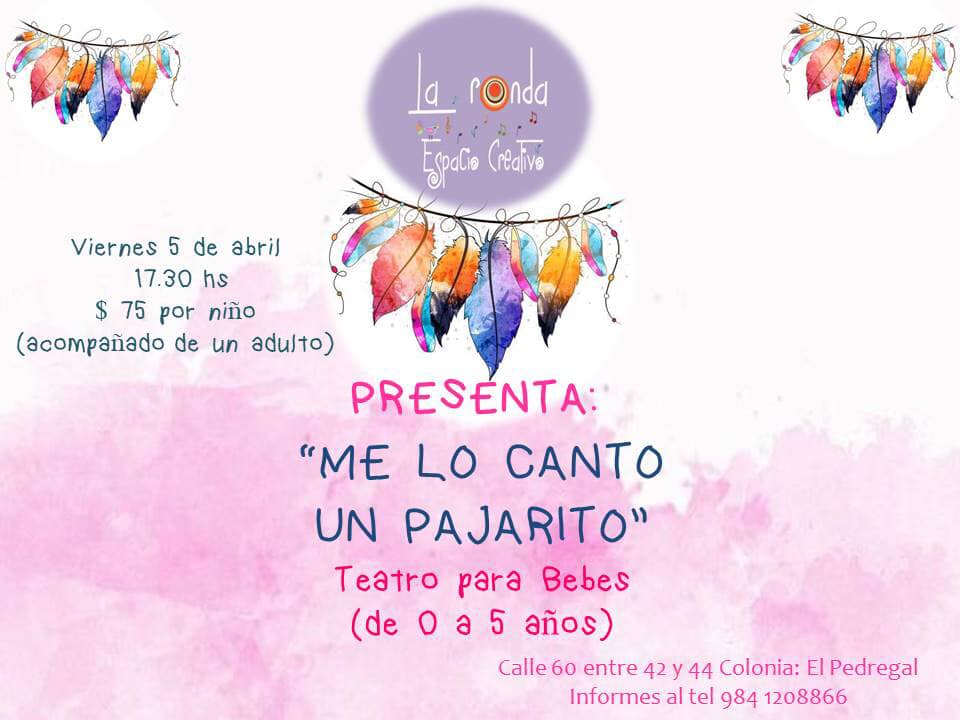 17:30 horas – “Me lo Cantó un Pajarito”, teatro para bebés de 0 a 5 años. La Ronda Espacio Creativo. Calle 60 entre 42 y 44, Col. El Pedregal. Costo: $75 pesos por niño acompañado de un adulto.