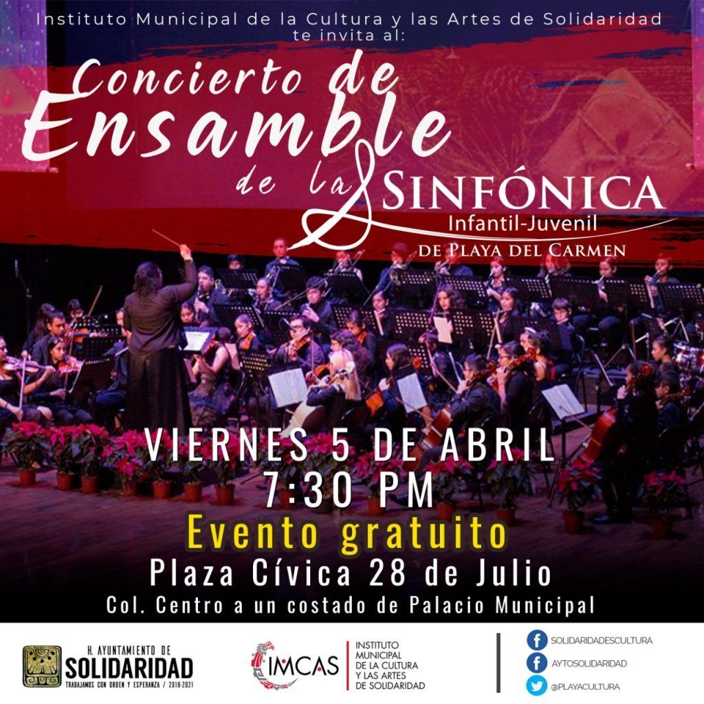 19:30 horas – Concierto de Ensamble de la “Orquesta Sinfónica Infantil y Juvenil de Playa del Carmen”, en los Viernes de Jazz en la Plaza 28 de Julio. Coordinado por IMCAS. Entrada libre.