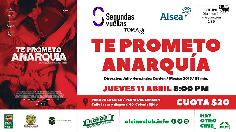 20:00 horas – El Cineclub presenta la cinta: “Te Prometo Anarquía” (Dir. Julio Hernández Cordón, México 2015). Parque La Ceiba. Cuota: $20 pesos.