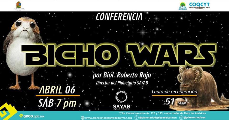19:00 horas – Conferencia “Bicho Wars”, por Biólogo Roberto Rojo, Director del Planetario. Planetario Sayab. Cuota de recuperación: $51 pesos.