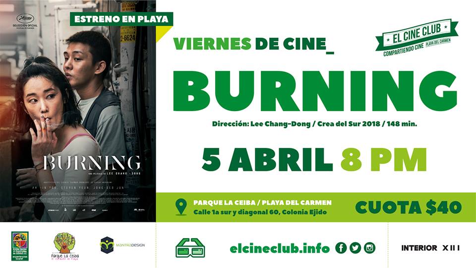 20:00 horas – El Cineclub presenta la cinta: “Burning” (Dir. Lee Chang – Dong / Corea del Sur 2018). Parque La Ceiba. Cuota: $40 pesos.