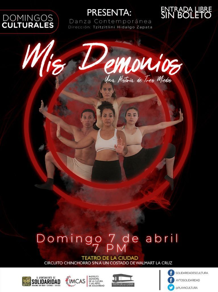 19:00 horas – Domingo Cultural en el Teatro de la Ciudad presenta: “Mis Demonios, Una Historia de Tres Miedos”, Danza Contemporánea. Coordinado por IMCAS. Teatro de la Ciudad. Entrada libre sin boleto.