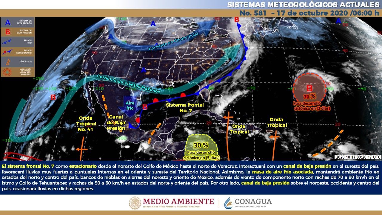 Para hoy, el sistema frontal No. 7 se extenderá como estacionario desde el noreste del Golfo de México hasta el norte de Veracruz, interactuará con un canal de baja presión en el sureste del país, favorecerá lluvias muy fuertes a puntuales intensas en el oriente y sureste del Territorio Nacional.