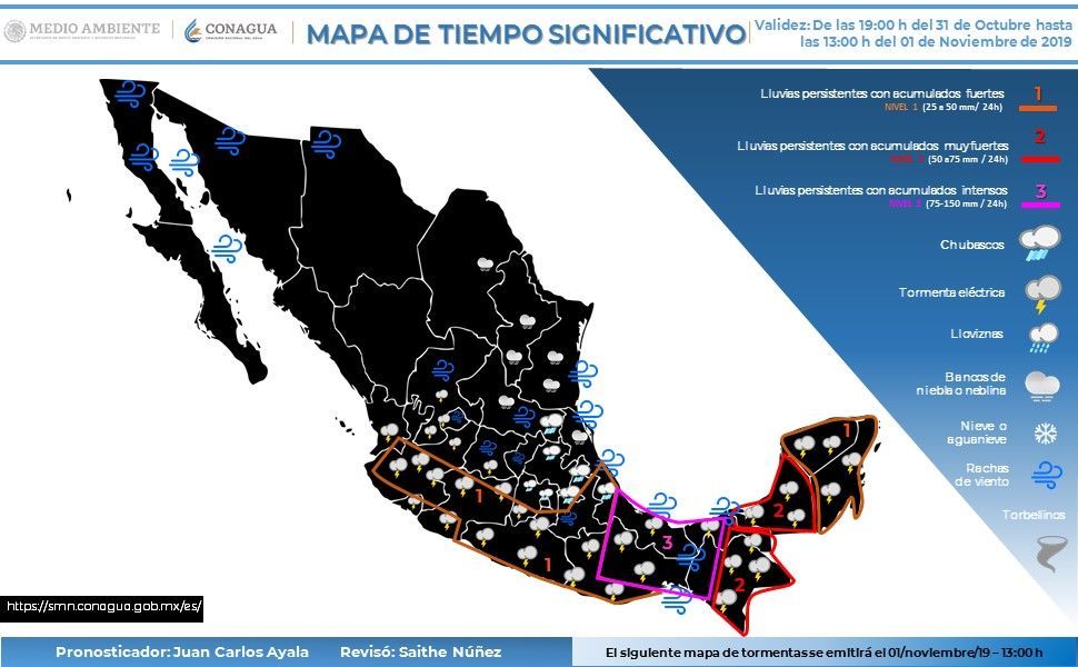 Se pronostica viento con rachas superiores a 60 km/h en las costas de Tamaulipas y mayores a 50 km/h en las costas de Campeche y Yucatán.