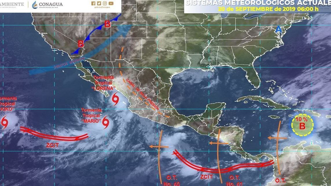 Las condiciones mencionadas serán originadas además por la tormenta tropical Mario en interacción con el ciclón tropical Lorena, la onda tropical número 41 que recorrerá el sureste del país.